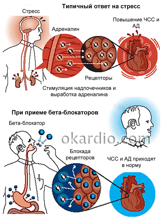 Однако при наличии определенных заболеваний, таких как аритмия или гипертония, такие реакции могут быть опасны, так как способны вызвать гипертонический криз или обострение болезни. Адреноблокаторы «блокируют» эти рецепторы, что приводит к противоположным эффектам: