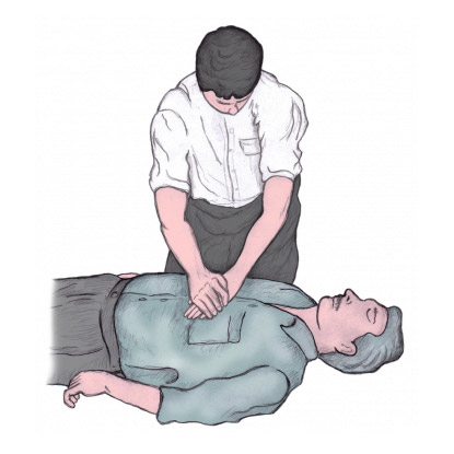 Первая помощь включает в себя проверку сознания и дыхания, вызов экстренных служб, а также выполнение сердечно-легочной реанимации, состоящей из непрямого массажа и искусственной вентиляции легких.