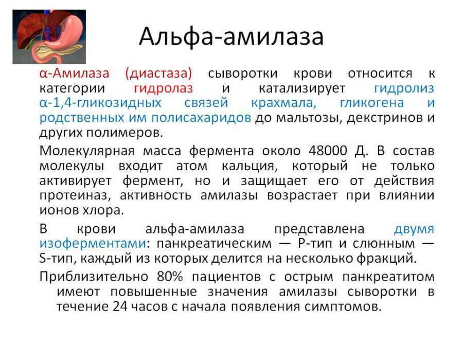 Это фермент, который отвечает за расщепление и усвоение сложных углеводов, таких как гликоген и крахмал (слово «amylon» происходит от греческого и переводится как крахмал). Основное количество этого фермента вырабатывается экзокринными железами, такими как слюнные и поджелудочная железа, а также в небольших объемах — яичниками, маточными трубами и легкими. Наибольшая концентрация амилазы содержится в пищеварительных соках: слюне и панкреатическом секрете. Однако незначительное количество этого фермента также присутствует в сыворотке крови, так как клетки всех органов и тканей постоянно обновляются.