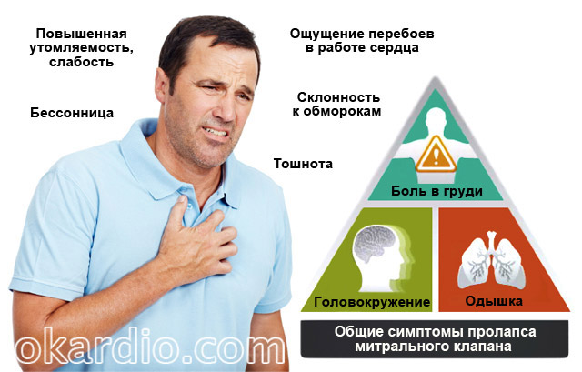 1. Если вторичный (приобретенный) пролапс митрального клапана возник в результате инфаркта миокарда, симптомы проявляются внезапно и сопровождаются признаками инфаркта: сильная боль в области сердца, одышка, ощущение «перебоев в работе сердца», головокружение, потеря сознания, возможны кашель и выделение розовой пены изо рта и другие.