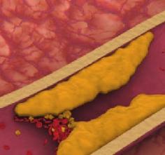 Холестериновый налет утолщается, образуя бляшки с образовавшимися сгустками крови, которые не могут пройти через узкий просвет сосуда.