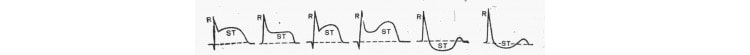 - Снижение сегмента ST в отведениях (V1 — V6, I, aVL) с дугообразным вниз направленным изменением;