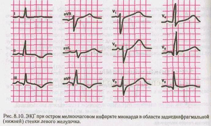 Оценка комбинированного Q-инфаркта осуществляется в отведениях: I, III, aVL, aVF, 3, 4, 5 и грудных. На электрокардиограмме инфаркт проявляется следующими признаками: