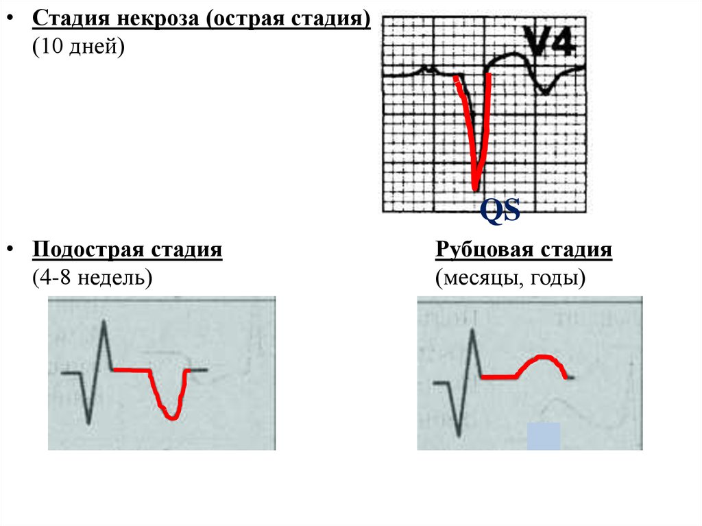 Рубцовая стадия считается завершающей. В области омертвевших тканей образуется рубец, и эта стадия продолжается до последнего сердечного сокращения. На электрокардиограмме она отображается в виде пика Q.