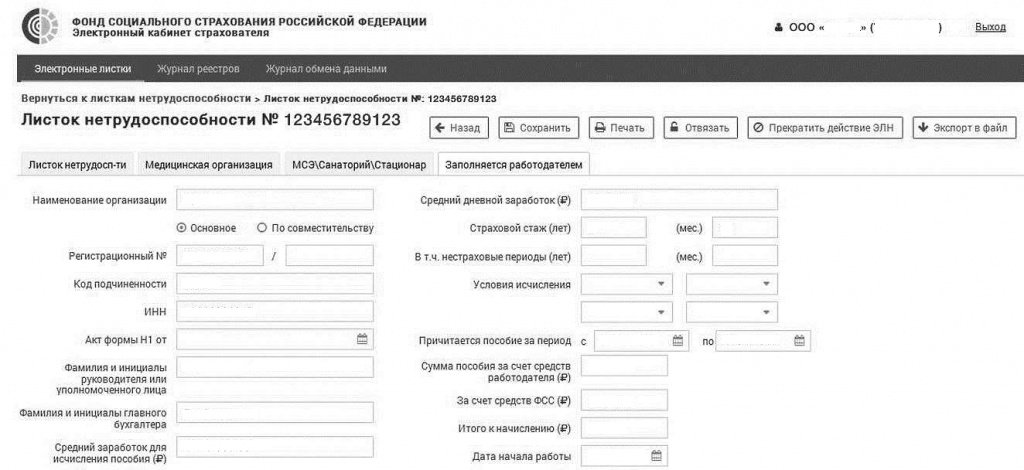 - после сохранения изменений информация автоматически отправляется в ФСС, который затем осуществляет компенсацию по больничному листу.