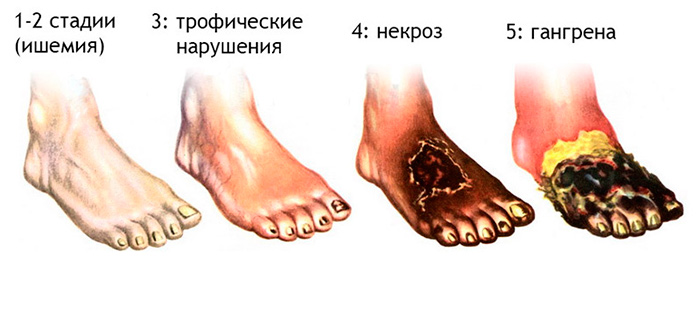 При атеросклерозе и тромбозе происходит закупорка сосудов нижних конечностей, что нарушает кровообращение. Сначала кожа становится бледной, ноги холодными и слабыми. Если не начать лечение вовремя, ткани начинают отмирать, что приводит к гангрене.