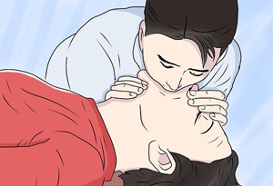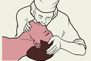 - Удерживая одной рукой открытую челюсть пострадавшего, другой плотно зажмите его нос, сделайте глубокий вдох и максимально выдохните в его рот.