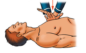 нащупать пульс на сонной артерии и, если он отсутствует, приступить к наружному массажу сердца. Для этого определить точку на два пальца выше нижнего края грудины и производить не менее 60 надавливаний на грудную клетку в минуту. Если реанимацию проводит один человек, каждые два быстрых выдоха должны чередоваться с 15 надавлениями на грудь; если помощь оказывают два человека, после каждого выдоха следует делать 5 надавливаний.