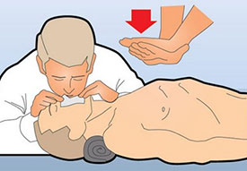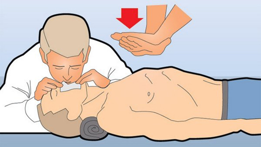 - Если сердцебиение отсутствует, необходимо одновременно проводить искусственное дыхание и непрямой массаж сердца.
