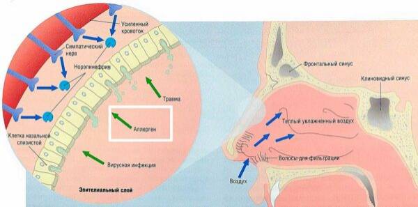 Повышенная отечность слизистой носа возникает при резкой активизации работы бокаловидных клеток и при расширении кровеносных сосудов. Вырабатываемая в большом количестве слизь приводит к отечности, которая в свою очередь становится причиной заложенности носа и обильного отделяемого.