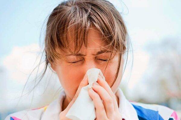 - Присутствие ринита аллергического типа. Слизистая носа отекает из-за воздействия аллергенов. Ситуация ухудшается весной, когда начинают цвести растения. Помимо этого, наблюдается першение в горле, а также чихание, раздражаются глаза.