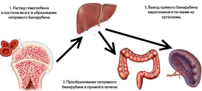 Синтез билирубина осуществляется по следующей схеме. Примерно через 120 дней после формирования в костном мозге, эритроциты выходят в кровоток и начинают разрушаться. В результате этого процесса из клеток крови выделяется гемоглобин, который состоит из двух основных компонентов: железосодержащего гема и белковосодержащего глобина. Из гема выделяется железо, которое организм использует как часть ферментов, а гемовый белок преобразуется в билирубин.