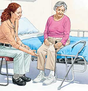 - Сначала пациента сажают на кровать на несколько минут, постепенно увеличивая это время. Затем его обучают стоять. По мере улучшения состояния больной начинает сидеть, вставать и ходить без посторонней помощи. При необходимости можно использовать опору, такую как стул или трость.