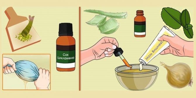 - в равных количествах берут сок цикламена и алоэ;