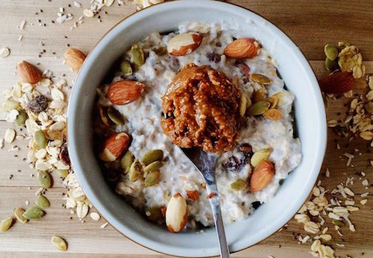 овсяные хлопья (с орехами и изюмом) с йогуртом 0% (150 г) или стакан соевого молока;