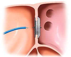 Окклюдирующее устройство устанавливается на катетер и вводится в полость сердца через бедренную вену. Процедура осуществляется под визуальным контролем рентгена. После введения катетера окклюдер разворачивается, как зонтик, и надежно закрывает отверстие. Этот метод значительно улучшает качество жизни пациентов.