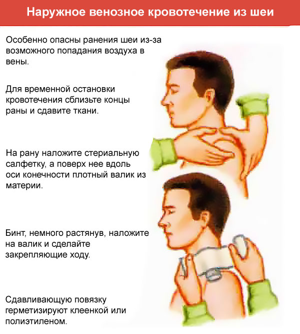 При повреждении вен шеи возникает сложность в пережатии кровоточащего сосуда, так как использование жгута здесь невозможно. Если есть риск развития серьезного состояния, человека следует как можно быстрее доставить в больницу.