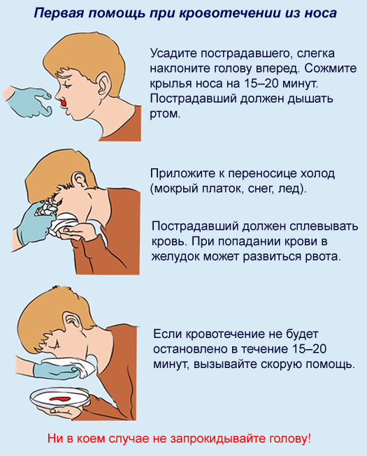 - категорически запрещается запрокидывать голову, втягивать кровь носом или глотать ее, так как это может привести к рвоте.