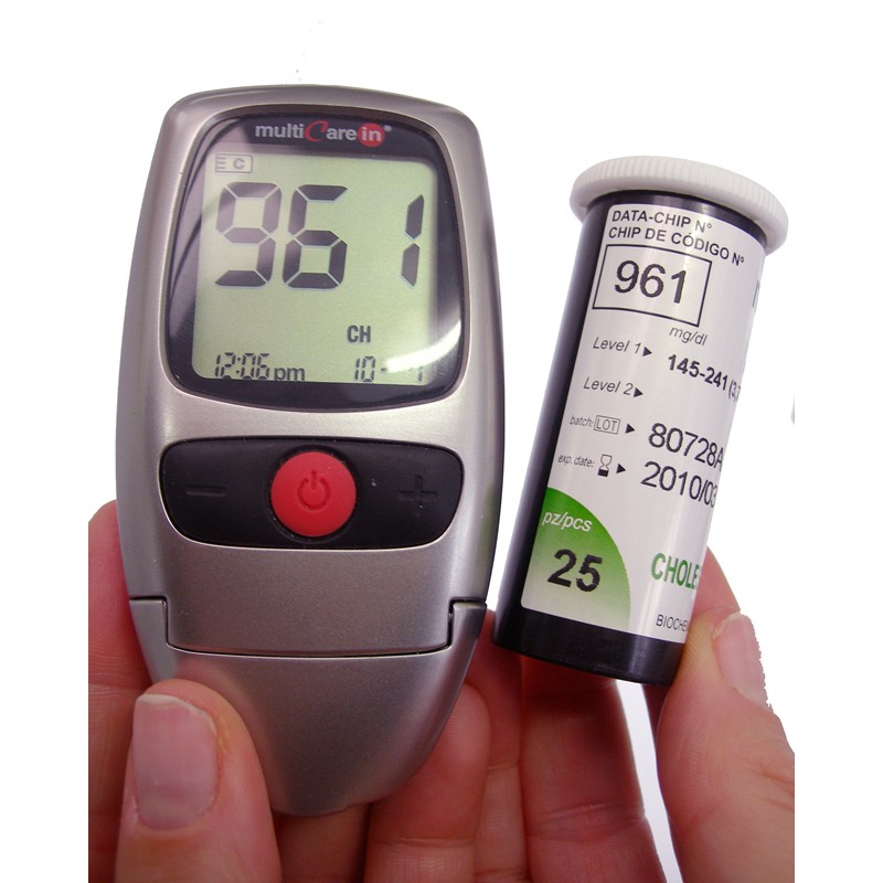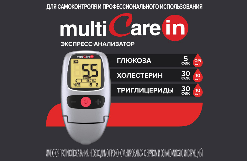 - Для определения холестерина по фракциям и уровня триглицеридов подойдет устройство MultiCare-in (Мульти Кэа-ин);