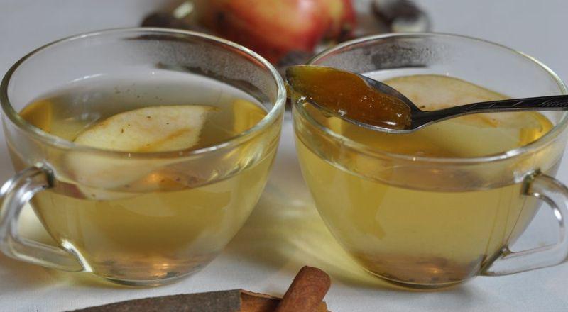 - Яблоки нарежьте тонкими ломтиками и поместите в термос объемом 1,5-2 литра. Добавьте туда чай и мед. Залейте горячей водой (при температуре 90 градусов, но не кипятком) и дайте настояться три часа.