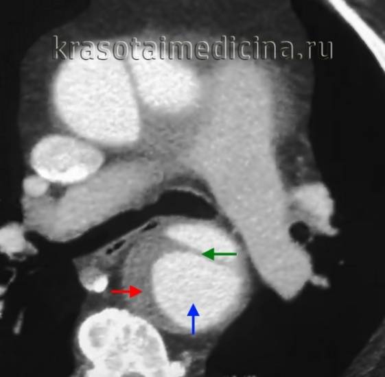 - ЭхоКГ. Трансторакальная и чреспищеводная эхокардиография позволяют оценить состояние грудной аорты, обнаружить отслоившийся лоскут интимы, различить истинный и ложный каналы, а также оценить работоспособность аортального клапана и степень атеросклеротического поражения аорты.