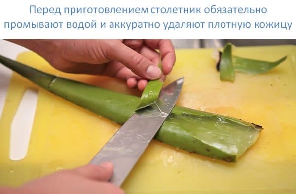- 100 г свежих листьев столетника промыть и просушить. Обрезать колючки, снять кожицу и нарезать небольшими кубиками.