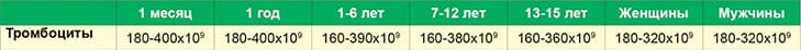 Нормальные значения тромбоцитов варьируются в зависимости от возраста ребенка: