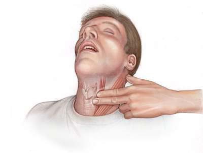 В этот критический момент необходимо действовать быстро. Чтобы не тратить время на определение пульса, следует поместить указательный и средний пальцы на область гортани пострадавшего и, не оказывая сильного давления, прощупать боковые стороны шеи.