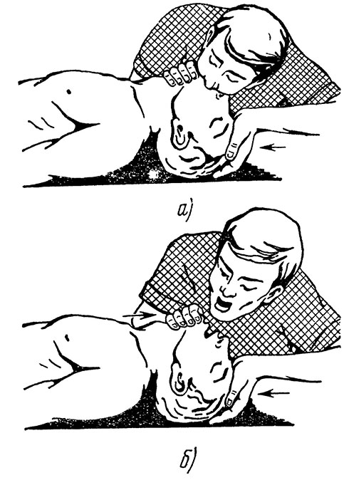 Удалив с помощью марли или носового платка рвотные массы, кровь или зубные протезы (если они есть), необходимо осторожно вытащить язык, чтобы он не перекрывал дыхательные пути. После этого приступают к искусственному дыханию.